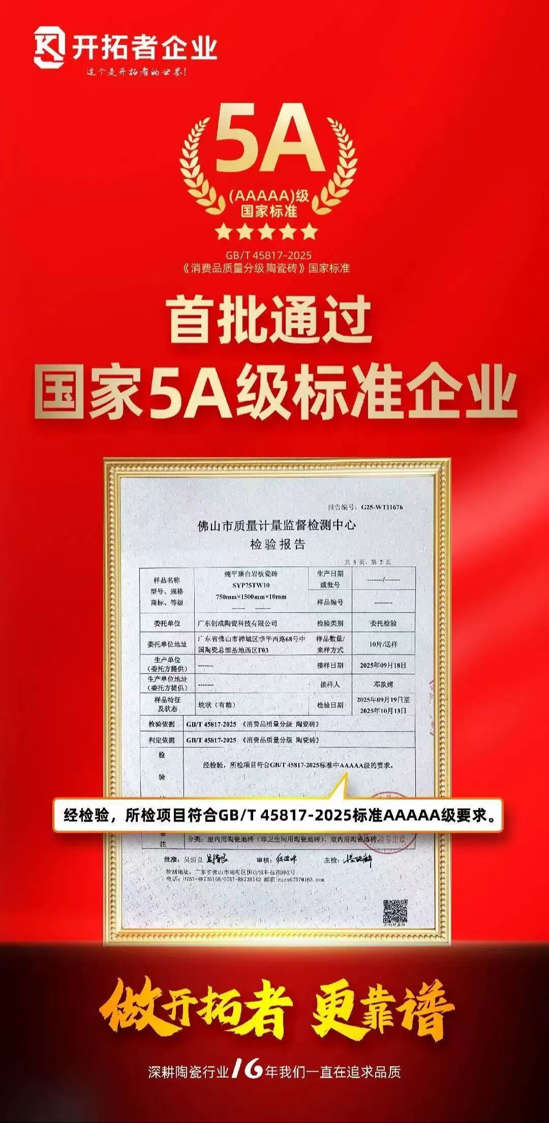 近日,广东创成陶瓷科技有限公司传来喜讯——该企业送检陶瓷产品顺利通过严格检测,荣获《消费品质量分级陶瓷砖》国家标准5A级认证,成为国内首批获此最高等级认证的企业之一。